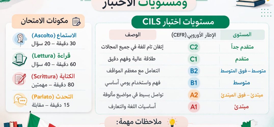امتحان CILS هو أحد أهم اختبارات اللغة الإيطالية المعترف بها دولياً. يتكون من عدة مستويات تبدأ من A1 حتى C2 ويقيس مهارات اللغة الأساسية مثل القراءة والاستماع والكتابة والمحادثة.