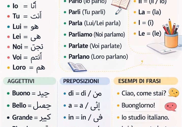 فهم قواعد اللغة الإيطالية هو خطوة أساسية لإتقان اللغة. عندما تتعلم الضمائر وتصريف الأفعال وأدوات التعريف والمذكر والمؤنث، يصبح من السهل تكوين الجمل والتحدث بثقة.