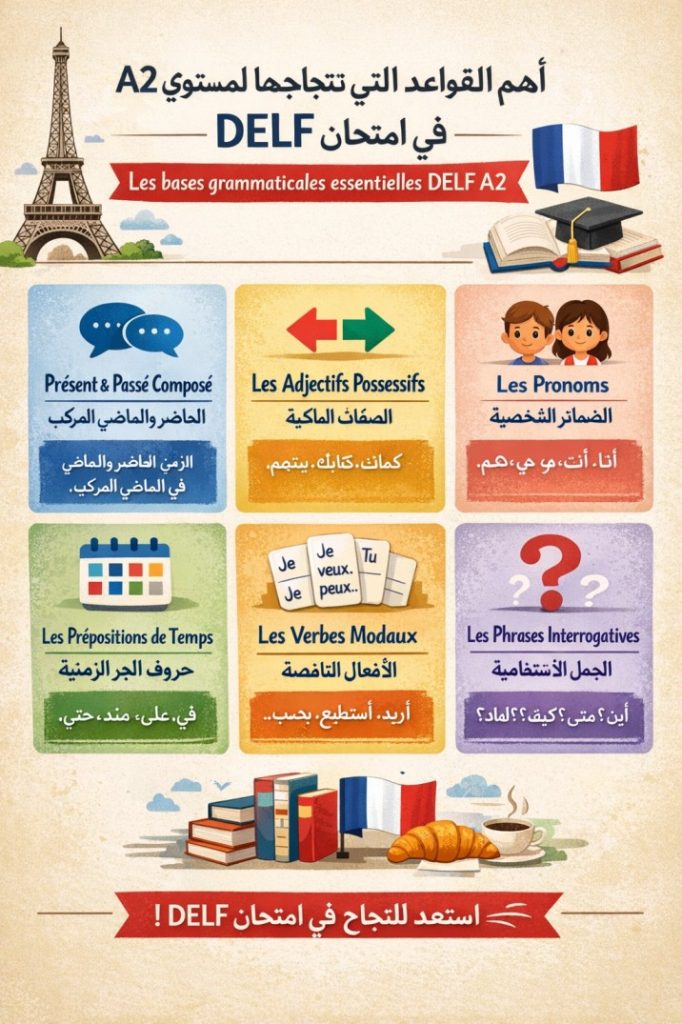 مقدمة للاجتياز بنجاح في مستوى DELF A1، لا تحتاج إلى تعلم قواعد معقدة، بل يكفي فهم الأساسيات التي تساعدك على تكوين جمل بسيطة وصحيحة. الهدف من هذا المستوى هو القدرة على: ✔ تكوين جمل بسيطة✔ التحدث عن نفسك✔ فهم الجمل اليومية✔ التواصل في مواقف الحياة البسيطة في هذا المقال، ستتعرف على أهم القواعد الأساسية التي […]
