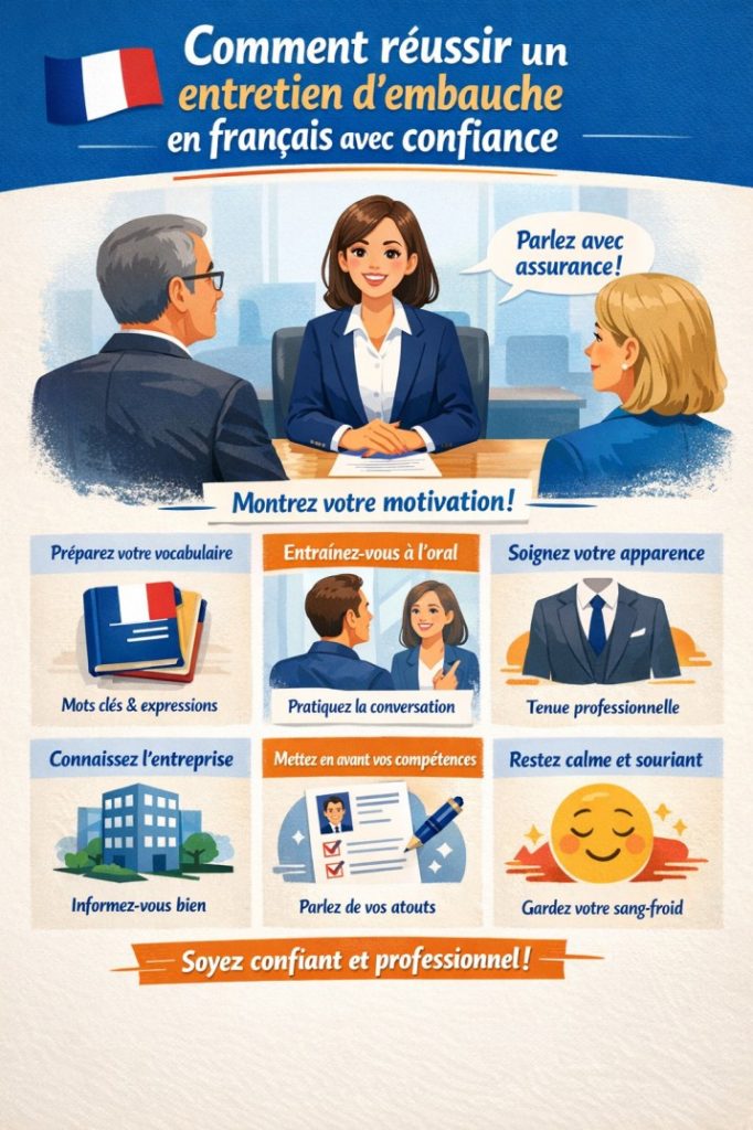 مقدمة إذا كنت تتقدم لوظيفة تتطلب اللغة الفرنسية، فإن مقابلة العمل (entretien d’embauche) تمثل خطوة حاسمة في حصولك على الوظيفة. النجاح في المقابلة لا يعتمد فقط على مهاراتك المهنية، بل أيضاً على قدرتك على التعبير بثقة، استخدام لغة واضحة، وترك انطباع احترافي. في هذا المقال ستتعرف على كيفية الاستعداد لمقابلة العمل بالفرنسية والنجاح فيها. كيف […]