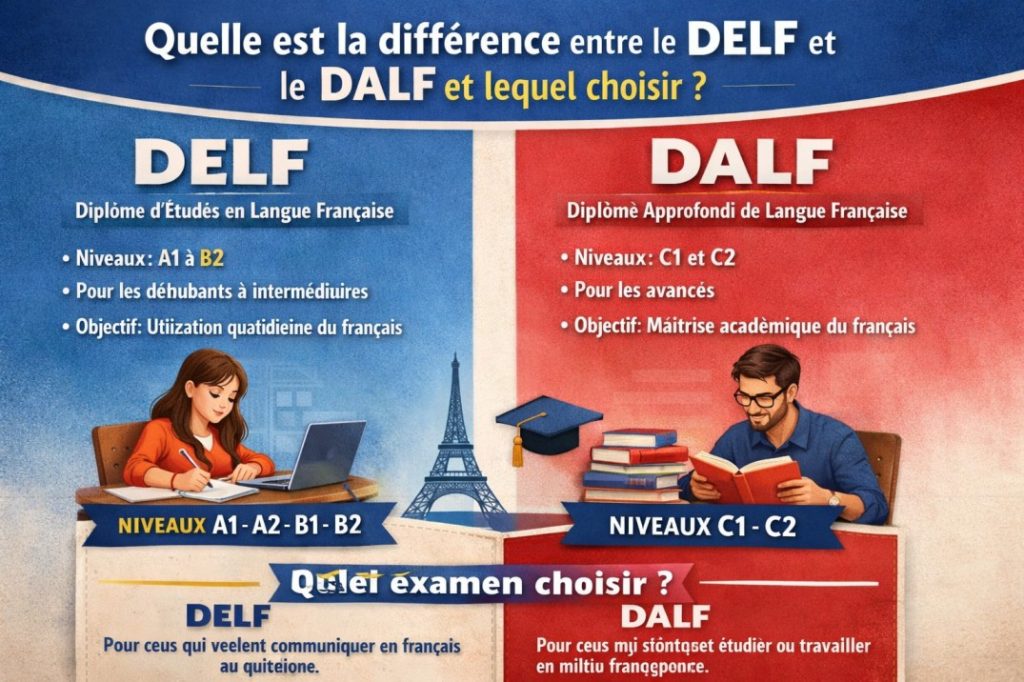 مقدمة إذا كنت تتعلم اللغة الفرنسية بهدف الدراسة، العمل، أو الهجرة، فربما سمعت عن شهادتي DELF و DALF. هاتان الشهادتان معترف بهما عالمياً وتثبتان مستواك في اللغة الفرنسية. لكن الكثير من المتعلمين يتساءلون: ما الفرق بين DELF و DALF؟وأيهما أحتاج لتحقيق أهدافي؟ في هذا المقال ستتعرف على الفرق بين الشهادتين وكيف تختار الأنسب لك. ما […]