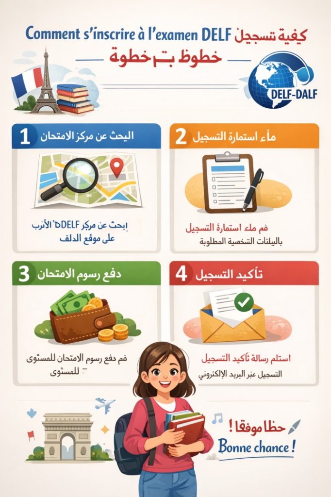 مقدمة إذا كنت ترغب في إثبات مستواك في اللغة الفرنسية لأغراض الدراسة أو العمل أو الهجرة، فإن شهادة DELF تُعد من أهم الشهادات المعترف بها دولياً. لكن كثيراً من المتعلمين يتساءلون: كيف يمكنني التسجيل في امتحان DELF؟أين أقدمه؟وما هي الخطوات المطلوبة؟ في هذا الدليل ستتعرف على طريقة التسجيل خطوة بخطوة. ما هو امتحان DELF؟ DELF […]